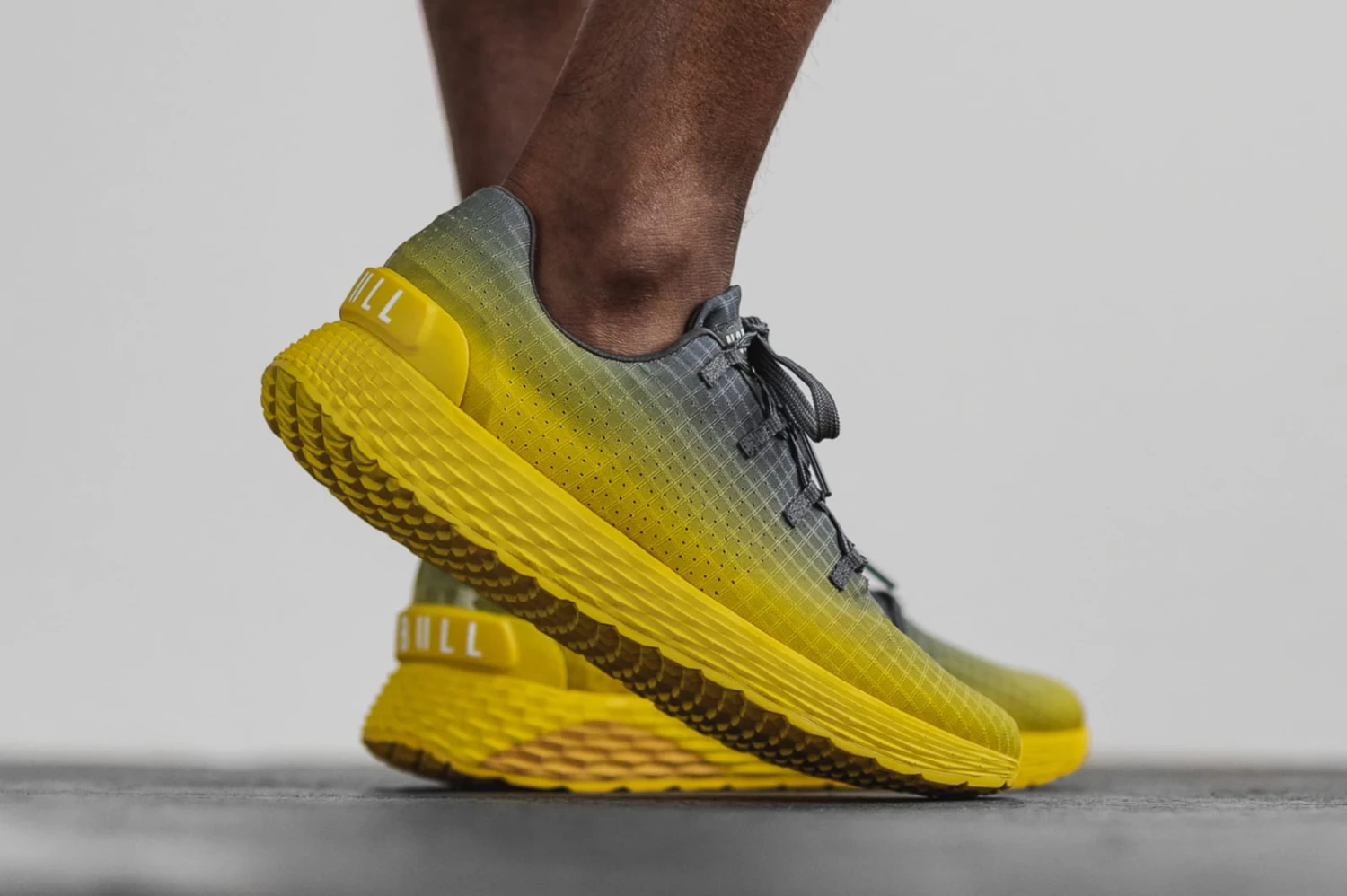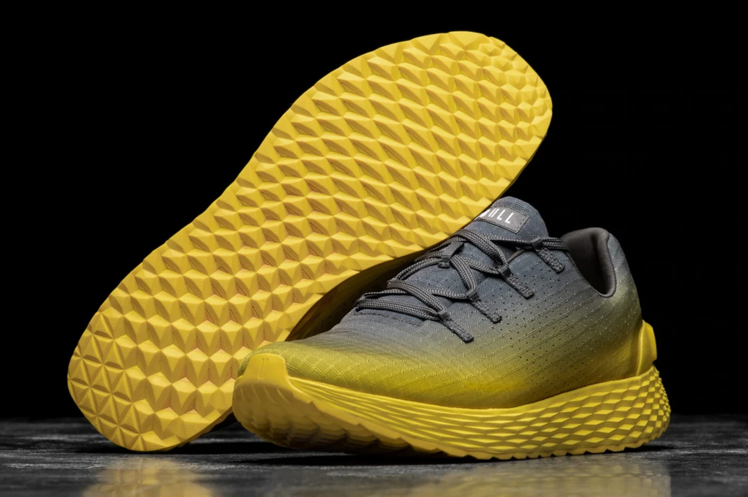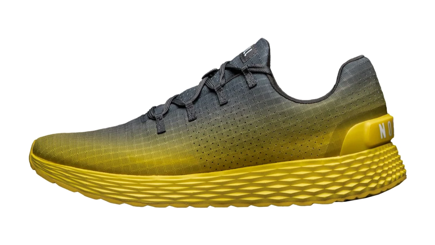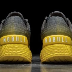 The Dark Gray Lemon Drop Gradient Ripstop Runner from NOBULL is a versatile, lightweight menโs running shoe featuring a perforated polyester Ripstop upper. Each pair also includes a dynamic lug pattern on the outsole for indoor/outdoor all-purpose training, internal collar padding for extra comfort, a removable anatomical sock-liner, and a durable Phylon midsole for high rebound cushioning.