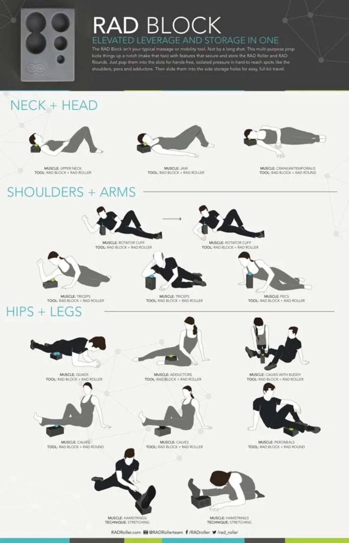 The RAD Roller can be popped into the RAD Block vertically or horizontally, depending on your goals, and the block itself features a rubberized exterior that wonโt damage your flooring or your skin during use. When youโre done training, your RAD accessories can also be stored within the RAD Block by sliding them into the storage holes in the side of the unit. Itโs the ultimate portable, all-in-one mobility kit.