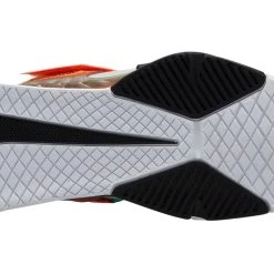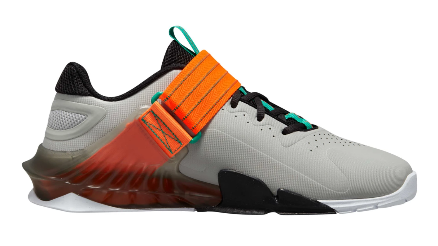 Available here in Gray Fog / Clear Emerald / Total Orange, Nikeโs Savaleos Weightlifting Shoe is optimized for max stability on the heaviest lifts, with a hook-and-loop strap that locks down the midfoot and an elevated heel for superior balance. The flat, wide sole makes a solid base under pressure, and the rigid midsole construction delivers excellent power transfer from the ground; vital for explosiveness.