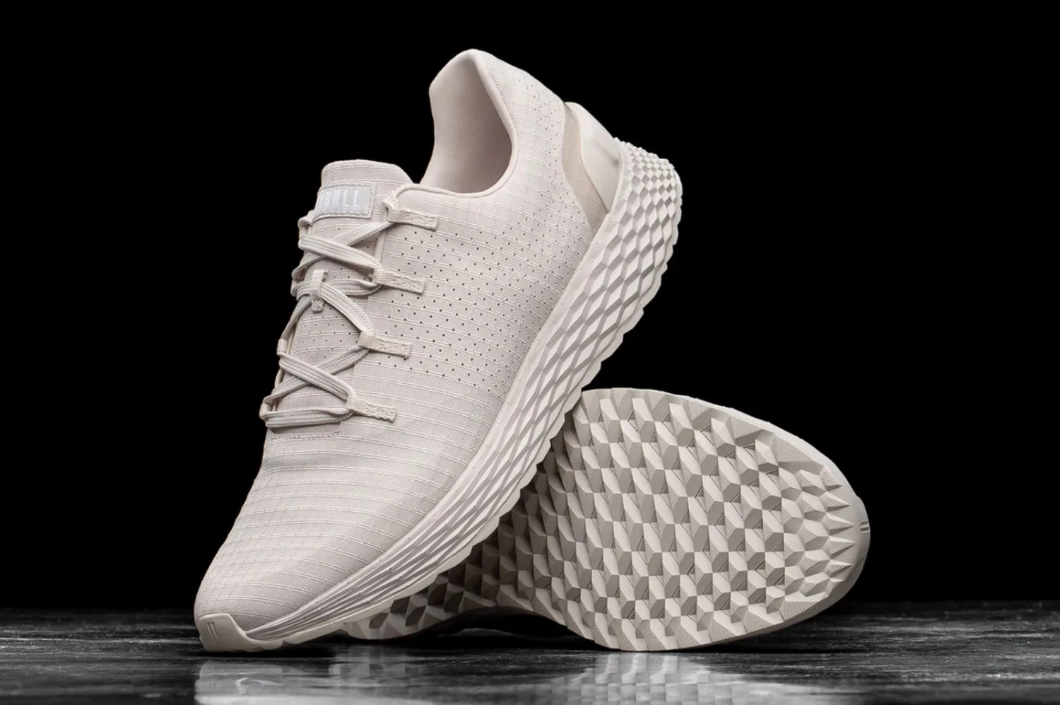 The Ivory Ripstop Runner from NOBULL is a versatile, lightweight menโs running shoe featuring a perforated polyester Ripstop upper. Each pair also includes a dynamic lug pattern on the outsole for indoor/outdoor all-purpose training, internal collar padding for extra comfort, a removable anatomical sock-liner, and a durable Phylon midsole for high rebound cushioning.