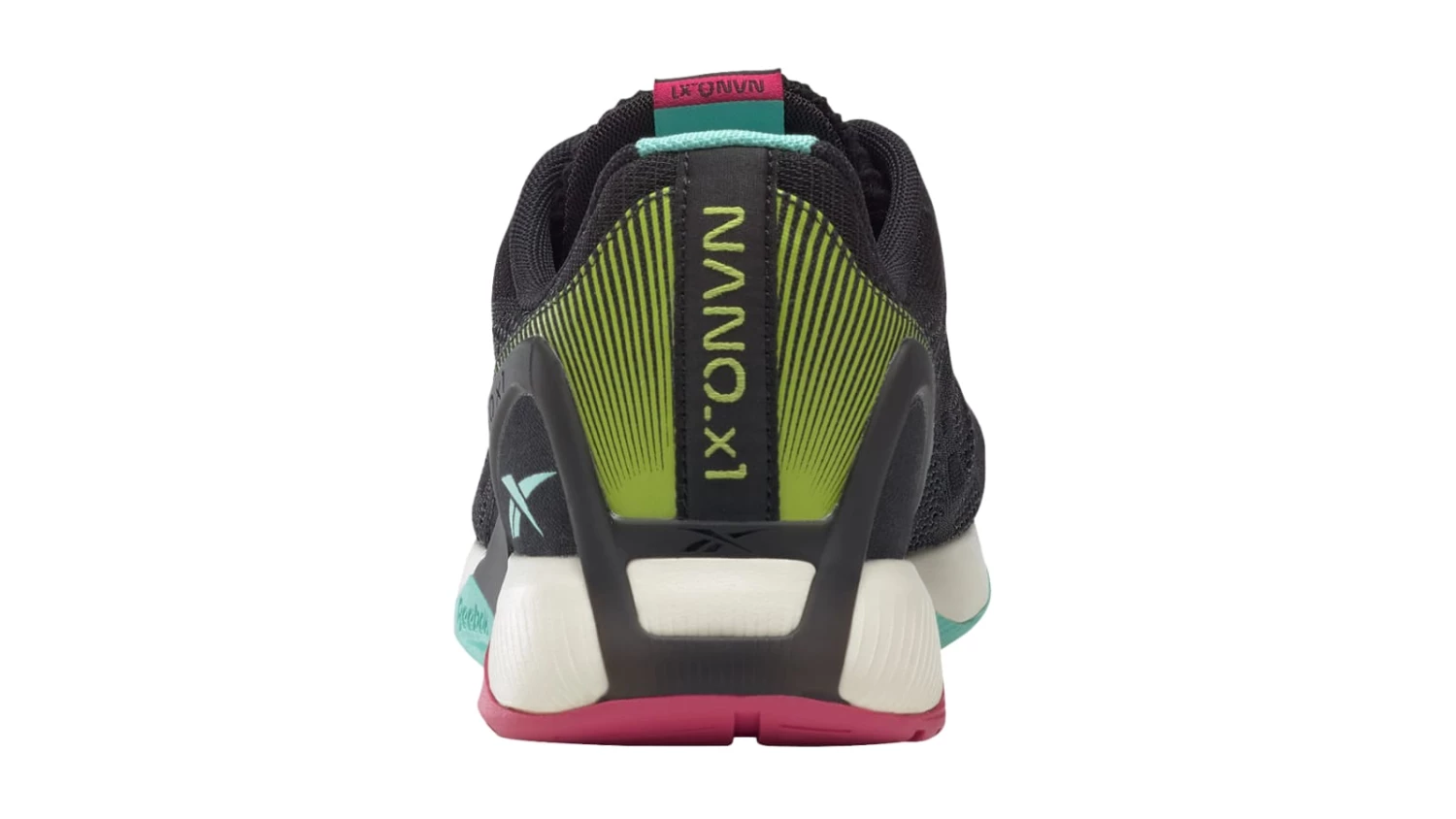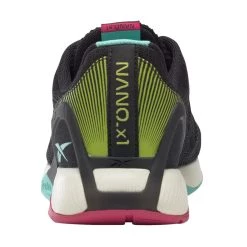 The Menโs Nano X1 Vegan is available here in Core Black with Pursuit Pink and Pixel Mint accents.